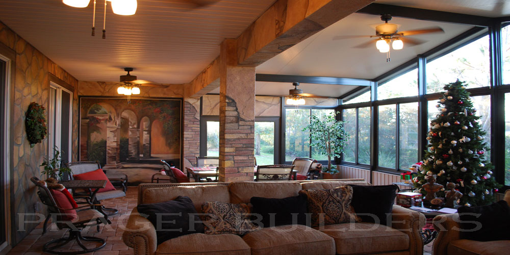 The installation of glass in this two story home enhanced this poolside living area. Viewed from inside, it is very bright and airy.